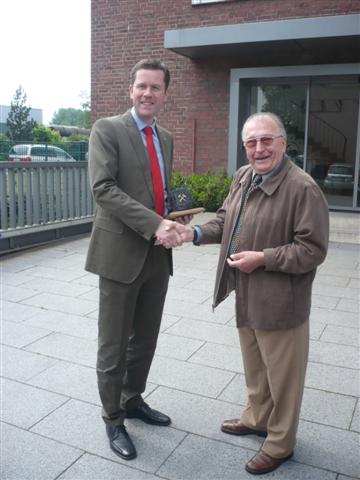 Siegfried Schramm bedankte sich bei Herrn Korn mit einem Stück „Schwarzem Gold“ für die Betreuung bei der Betriebsbesichtigung.