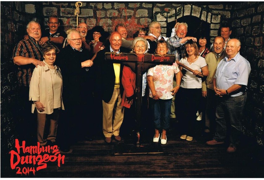 Zum Ende unsere Gruppenreise ging es in die dunkle Vergangenheit ins Hamburg Dungeon. Die Besichtigung startete mit dem Fahrstuhl des Grauens. Es schien so als wenn unterwegs einige Spurlatten fehlten, denn es rappelte und klapperte ganz schön. Raus aus dem Fahrstuhl und ab in die Bibliothek. Hier wurden wir über Hamburgs-Pest im 13. und 17. Jahrhundert sowie über das große Feuer im Jahre 1842 informiert. In der Kammer der Qualen sahen wir diverse Folterwerkzeuge. Näher gezeigt wurde eine Zange zur Entmannung. Leider gab es kein Freiwilligen für die Vorführung dieses Werkzeuges. Die anschließende Inquisition traf leider einen unserer Teilnehmer. Dieser wurde dazu verurteilt am Samstagmorgen um 9:00 Uhr in Hamburg auf dem Marktplatz zu erscheinen um seine gerechte Strafe zu erhalten. Im Pestkrankenhaus an gekommen half eine unserer Teilnehmerinnen dem Doktor bei der Untersuchung des an Pest verstorbenen Professors. Im Anschluss sahen wir die Hinrichtung von Klaus Störtebeker. In der nachfolgenden Spelunke sagen wir das Lied „Wir lagen vor Madagaskar“ und hörten die Geschichte vom Klabautermann. Zum Abschluss gab es eine Bootsfahrt durch die Hamburger Geschichte.