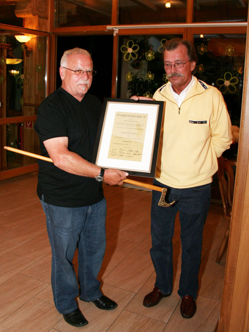 Nach dem Abendessen bedankten sich die Mitglieder des BV beim Chef der Fa. BWS für seine tatkräftige Unterstützung und seine generöse Art. Sie überreichten ihm einen Ehrenhäckel und verliehen ihm den Titel „Fahrsteiger h.c“ , dokumentiert durch eine gerahmte Ehrenurkunde, auf der sich alle Teilnehmer der Schmalkaldentour 2011 verewigt hatten. Dazu gab es einen edlen französischen Tropfen.